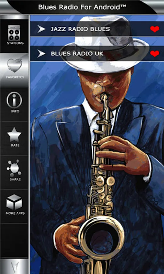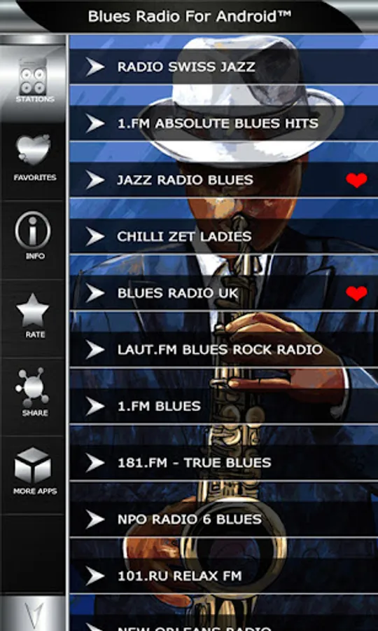 This cool blues radio stations app offers you the most listened online world radio stations with the most popular music. Here you can find wonderful channels with fantastic best blues music, country blues music, delta and electric blues. There are many online radio stations playing only the greatest hits of the most popular artists and bands from all over the world. Live streams let you listen to hot blues music in high quality. Beautiful ballades, rhythm, melancholic songs are typical for this music genre. Blues also has and other characteristics such as lyrics, bass lines and instruments, like guitar. Best free online music on your mobile with just one keyboard touch. This FM radio online music app is great collection of carefully picked and the most popular radio stations from the web. Thanks to the live streaming, online Cajun and Zydeco Blues music is a click away from you. We collected here the best internet blues radio stations in this soundboard. Enjoy numberless hours of relaxing, calm and popular love songs wherever you are. Enjoy live broadcastiing, romantic and love music melodies, chill out melodies and melancholic hits where ever you go. Fm radio tuner is the best way to listen to live radio on your mobile device. Listen top free music online on FM radio. This application lets you listen to radio in high quality sound using Wi-Fi network. This is free music app in which you can listen to online radio stations, thanks to live streaming. Listen best free online music, news, talks as well as sports news and weather information. Finding web radio for your Android phone or tablet has never been easier. Touch play on your screen, sit back and enjoy. Free radio app allows you to listen to stream music online on your cell phone. In these radio stations you will find the most popular blues songs from all over the world. The only thing you need is a stable internet connection.
