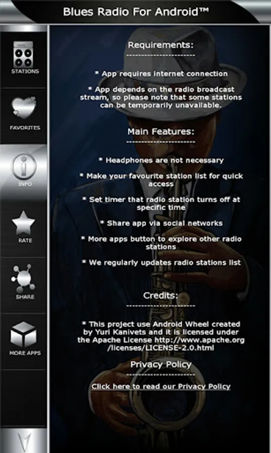 All blues fans and everybody who love quality music on radio are welcome to download Free Blues Music Radio App. Live streamings, great collection of the best free radio stations who play blues from all around the world. But as well and others radio stations who play related top music genres, such as jazz, gospel or other melancholic music which can calm your soul and relax your body. All radio stations in this application are live streams and you can listen them all the time. Listen to most popular online blues music on your mobile or tablet from some of the best blues international radio stations and channels around! Enjoy acoustic blues, chicago blues, contemporary blues, and much more. With online stations from all over the world, featuring mostly slow, relaxing blues music and chill out melodies, you will find some time to indulge yourself. Download free and enjoy in your favorite blues internet radio stations! FM radio tuner is the best way to listen to the radio on your Android device. Latest radio stations for free. Enjoy live broadcasting anywhere you go.