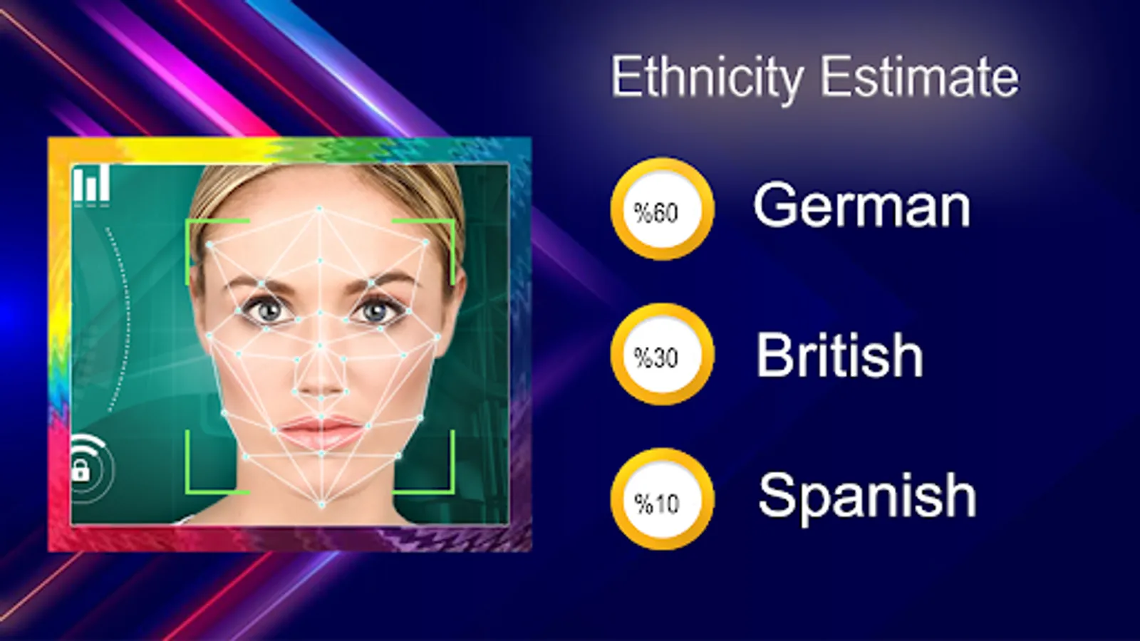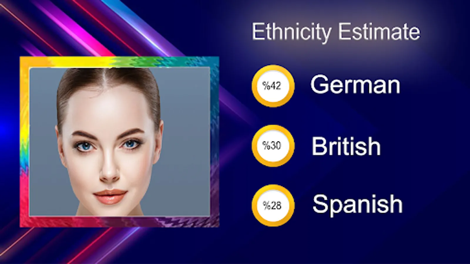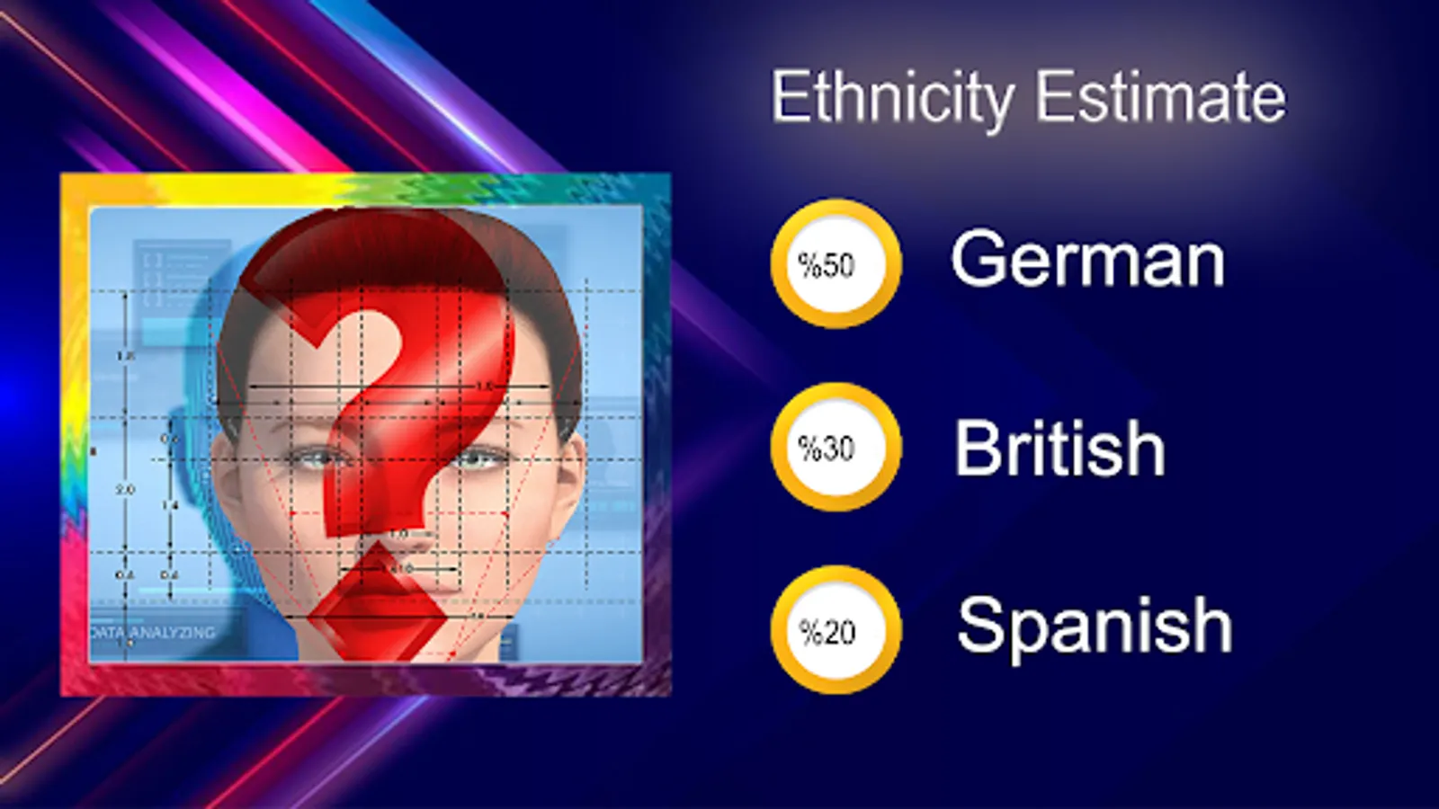 Your Face test results include an Ethnicity Estimate: fun app that shows the ancestry of your ancestors from 42 ethnic backgrounds, including Japanese, Irish, Italian,Kurdish Jewish or many more!