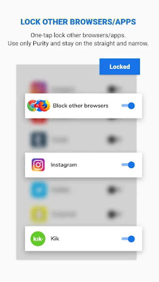 One-tap lock hundreds of other browsers. Use only Purity and stay on the straight and narrow. Add unlimited number of apps to your personal app lock list.