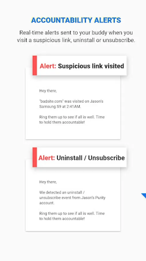 Suspicious links visited are reported to your buddy for accountability, also when you uninstall and unsubscribe. Be held accountable for your actions.