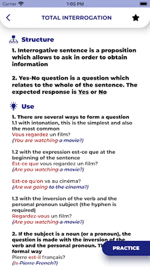 Whether you are an French language learner, or a native French speaker, your target test is TCF, DELF or DALF, this application will help you with French structures. Furthermore, by improving your French grammar, your writing and speaking will both improve, too.