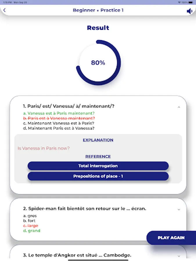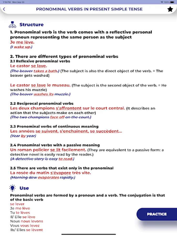 This French grammar app covers all 163 grammar points using clear explanations, real-life examples, and many tests to help you practice French grammar. A unique feature that we are proud of is that we provide many tips to help you realize grammar points, distinguish between similar grammars and how to use them in real-life situations.