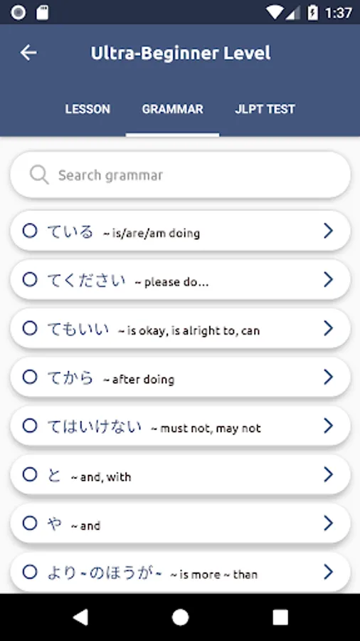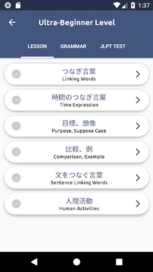 • Each level contains over 400 grammar activities, split into about 20 tests, are made to mimic a real JLPT exam, to prepare you to JLPT test