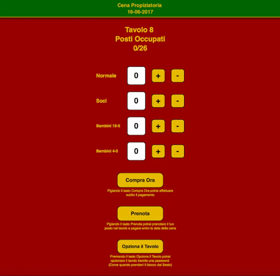 The application will allow you to book your place for two great evenings of the week of the neighborhoods is Red Green, the propitiatory dinner and dinner macaroon. You can book and pay your ticket now or book and pay for it later directly online or at the open space of the Colcitrone manager Sestini Roberto.