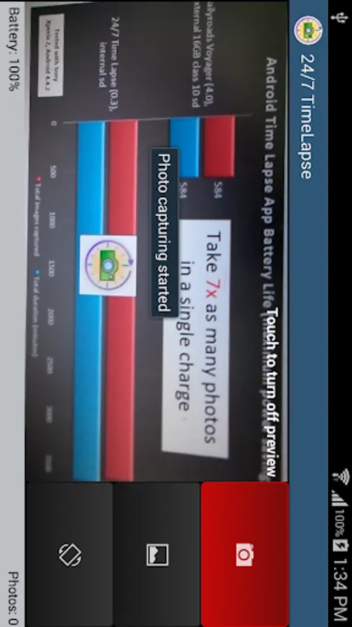 To maximize your battery life when using this application, before you start photo capture, make sure you turn on airplane mode, check both WIFI and GPS are turned off. After photo capture is started, press Home button to put the app into background mode and then turn off the device's LCD screen as well.