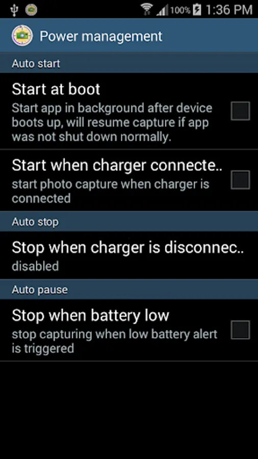 - Can be configured to start at boot to resume capture if forcibly closed while capturing photos