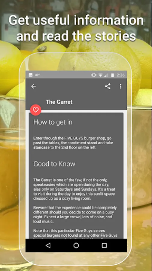 Explore the best historic bars and New York speakeasies. Navigate the app’s integrated map and find the exact location of the place you want to visit. After reading about the bar you can choose to add it to your Favorites. The app is highly informative and constantly updated.