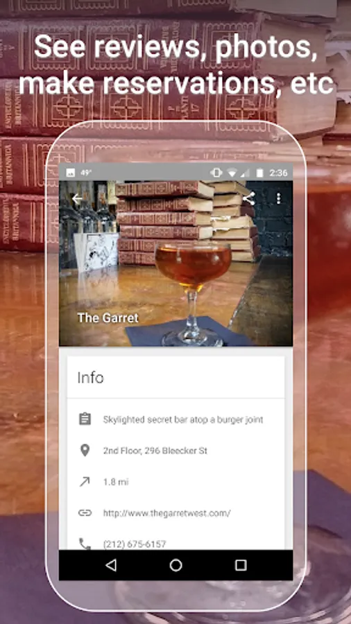 Just tap the place to find useful information about it. View its working hours, see its average drink price, make a reservation, search happy hour information, view photos, and read reviews from real customers.