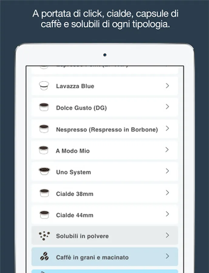In the app you will find coffee and soluble pods and capsules, personalized sugar sachets and vending machines.