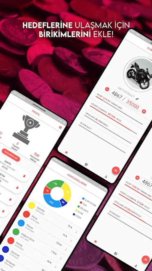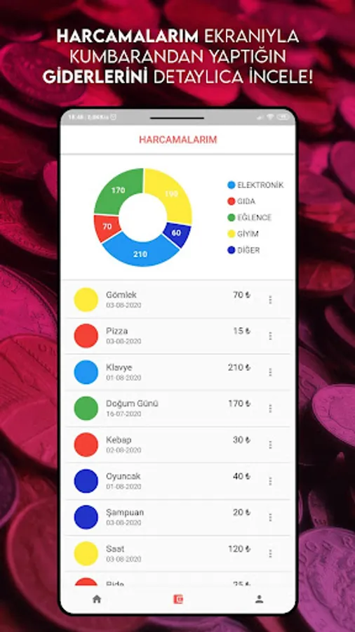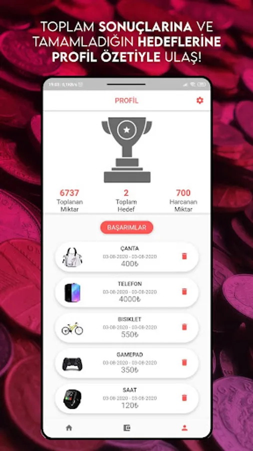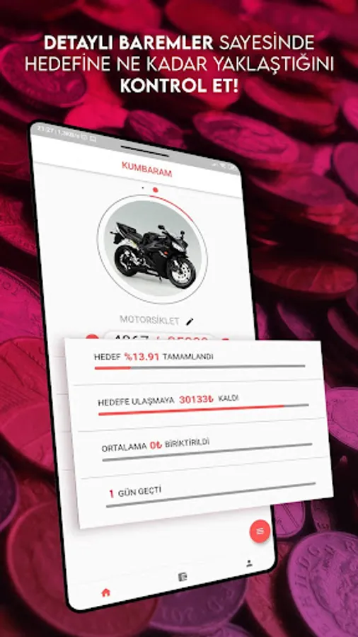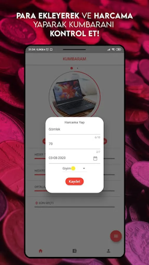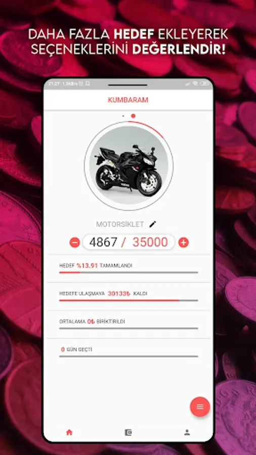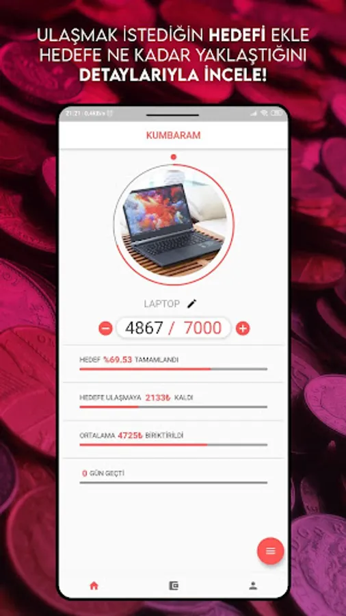 Add the goal you want to buy and examine in detail how close you are to your goal each day. Get detailed information about your goal by adding every amount you add to your piggy bank to our application. By adding multiple goals, you can switch between your goals and see the differences between them.