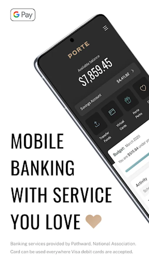 PORTE is a deposit account established by Pathward, National Association, Member FDIC, and the PORTE Debit Card is issued by Pathward, N.A., pursuant to a license from Visa U.S.A. Inc. Certain products and services may be licensed under U.S. Patent Nos. 6,000,608 and 6,189,787. Card may be used everywhere Visa debit cards are accepted.