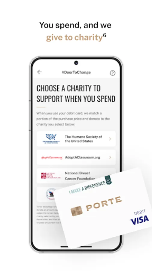 CHARITABLE GIVING: Porte gives to charity when you spend.⁶ Choose a charity in the app and when you make purchases, we make donations.