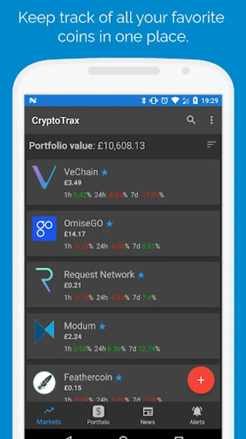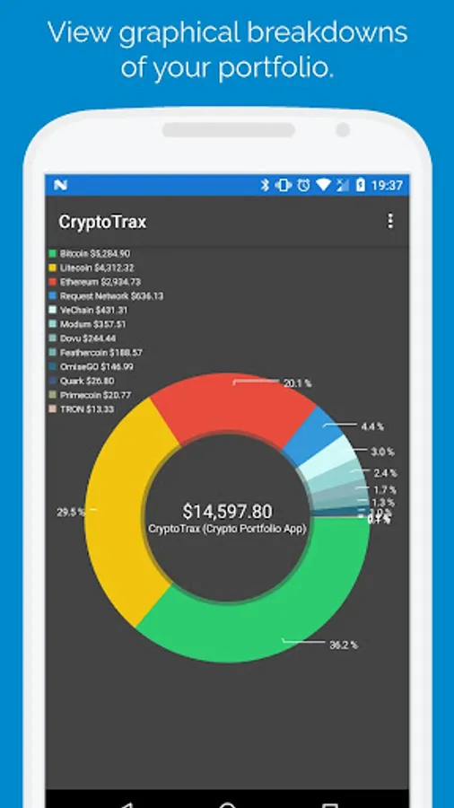 * Pie chart view and perspective of your cryptocurrency portfolio.