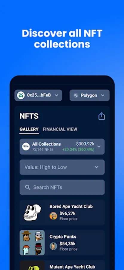 * Check your NFT collection. View your NFT collection, current valuations, floor prices, P&L data and share content with your followers on social media.