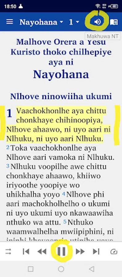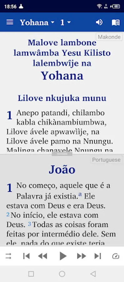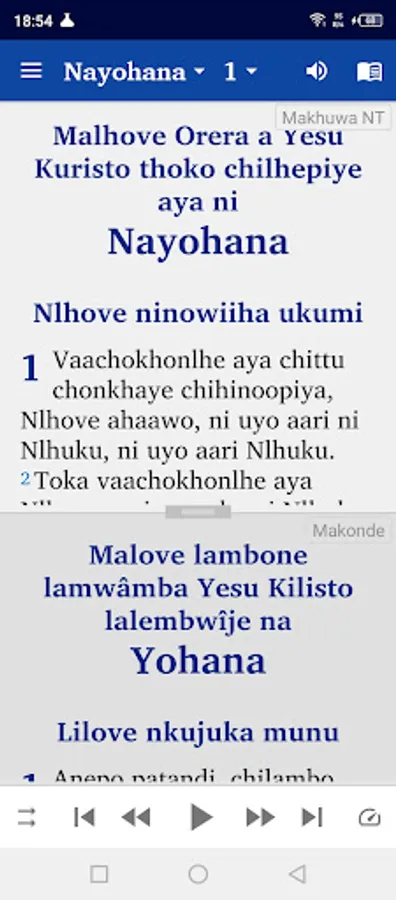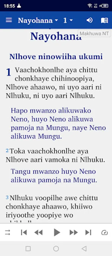 - "verse by verse" to display a verse in Makhuwa followed by the same verse in one of the other languages of your choice.