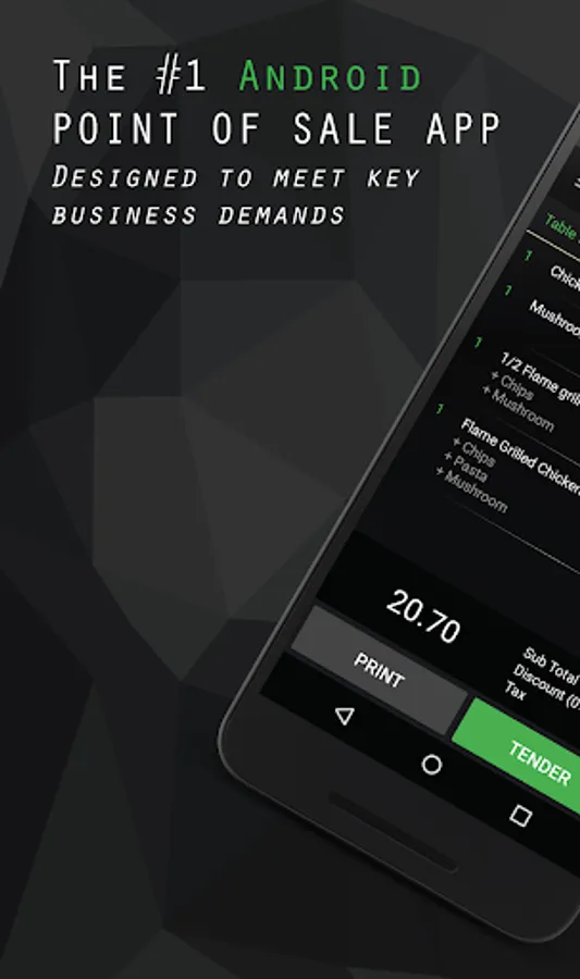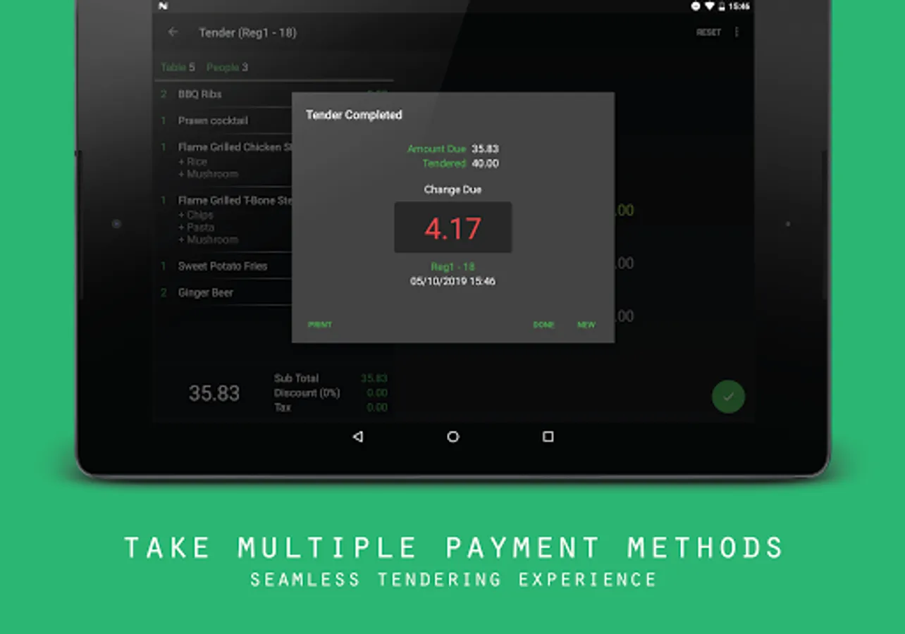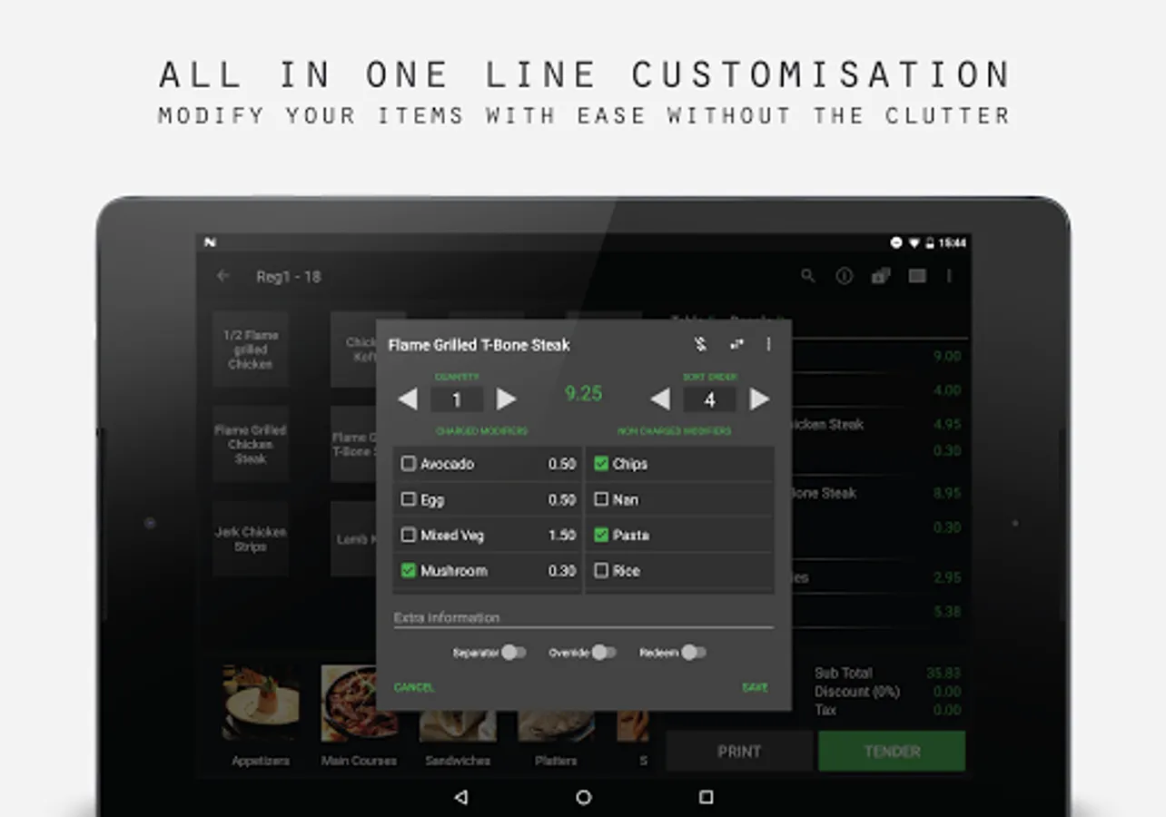 Smart intuitive new order screen. Line modification (i.e change quantity, add modifiers, price override, discount), add miscellaneous items, discounts (named discounts, by value and by percentage), split bills, barcode scanning (using on board device camera), automatic order parking with elapsed time and tender using multiple payment methods. Add order information such as customer details, table, people and the type of order i.e collection, delivery or waiting.