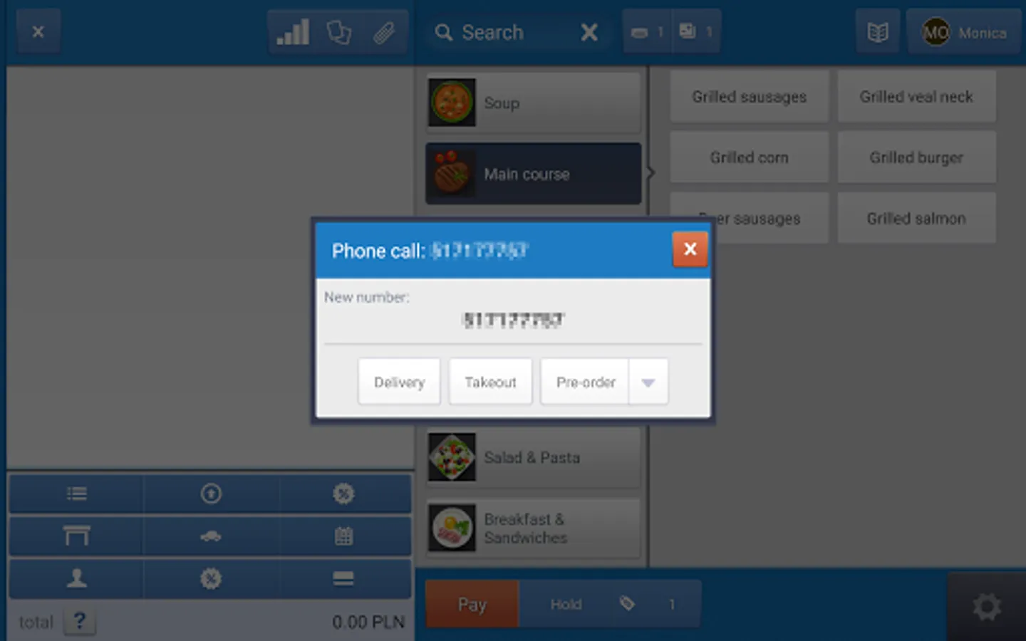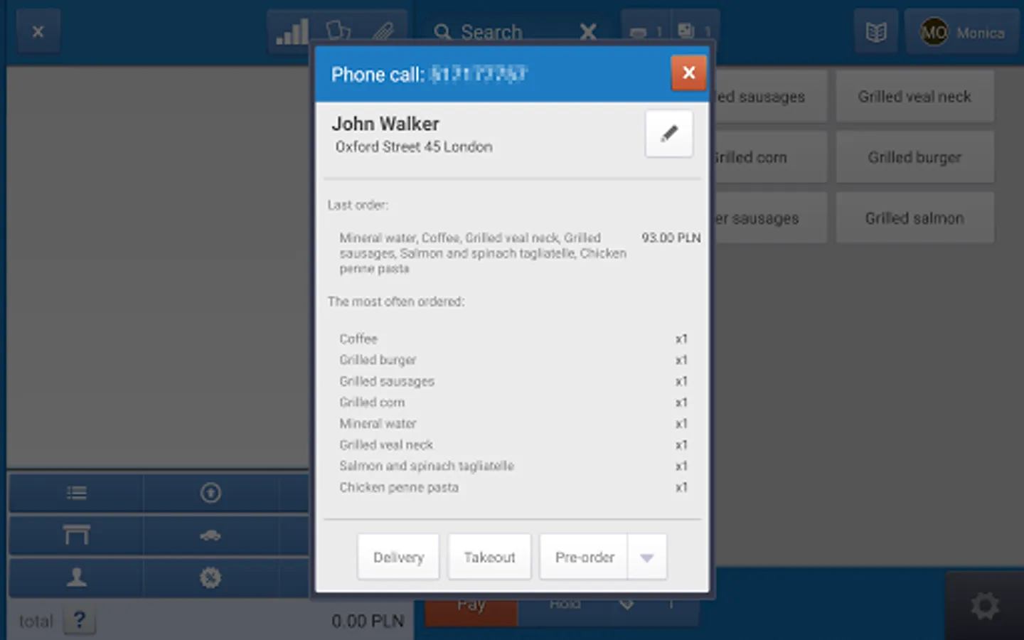 How does it work? It's very simple! When a customer calls to the premises to place an order, a pop-up information about him appears on your tablet, or if this is a new person you can save his data in your own customer database. A waiter, therefore achieves quick information about the customer, as well as the history of his orders and recently purchased items from the menu. The waiter also has the possibility to select an option, whether the order will be: in delivery, as a takeaway or pre-order.