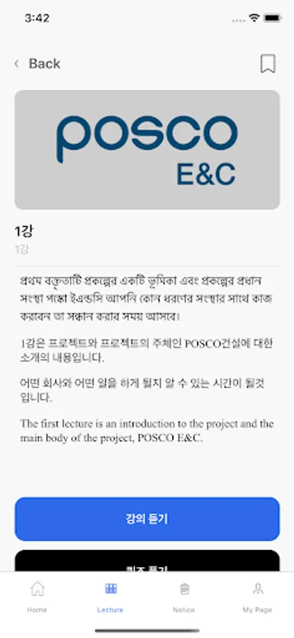 PCCT (POSCO E&C Construction Craft Training) application is an application for fostering construction skills created by POSCO E&C, POSCO 1% Sharing Foundation, and Inha University International Development Cooperation Innovation Center to practice corporate citizenship management philosophy. Bangladeshi youth who wish to get a job in construction can learn practical theories such as Korean culture, construction basics, safety, and woodworking through the application, as well as practical exercises for each specific major online, and take quizzes.