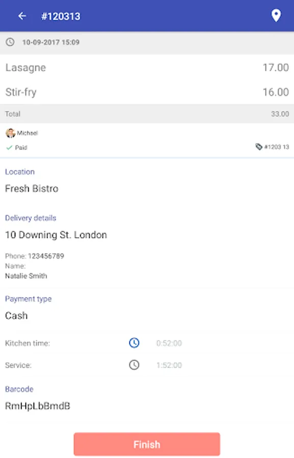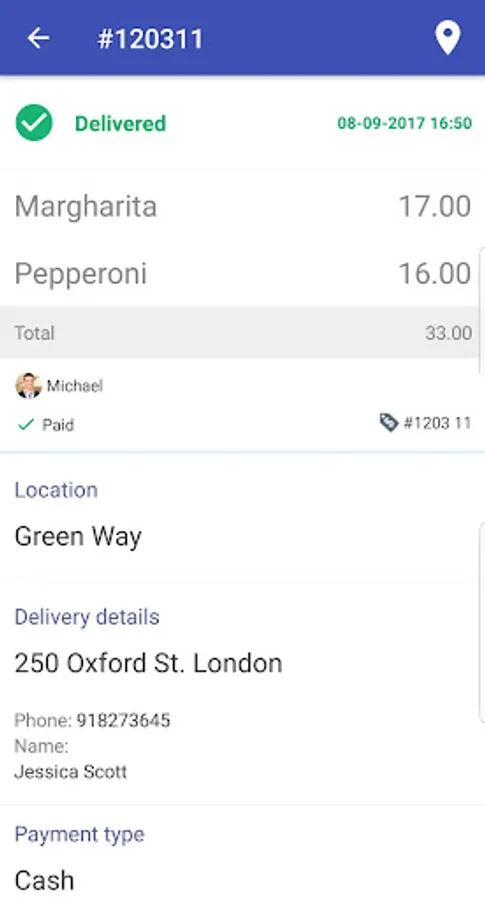 Orders and payment details - the driver can look at the details of each order he's distributing. This includes information about the address and customer’s phone number, each position on the bill, as well as form of payment. When the order is delivered, the driver selects the mode of payment and carries out the transaction.