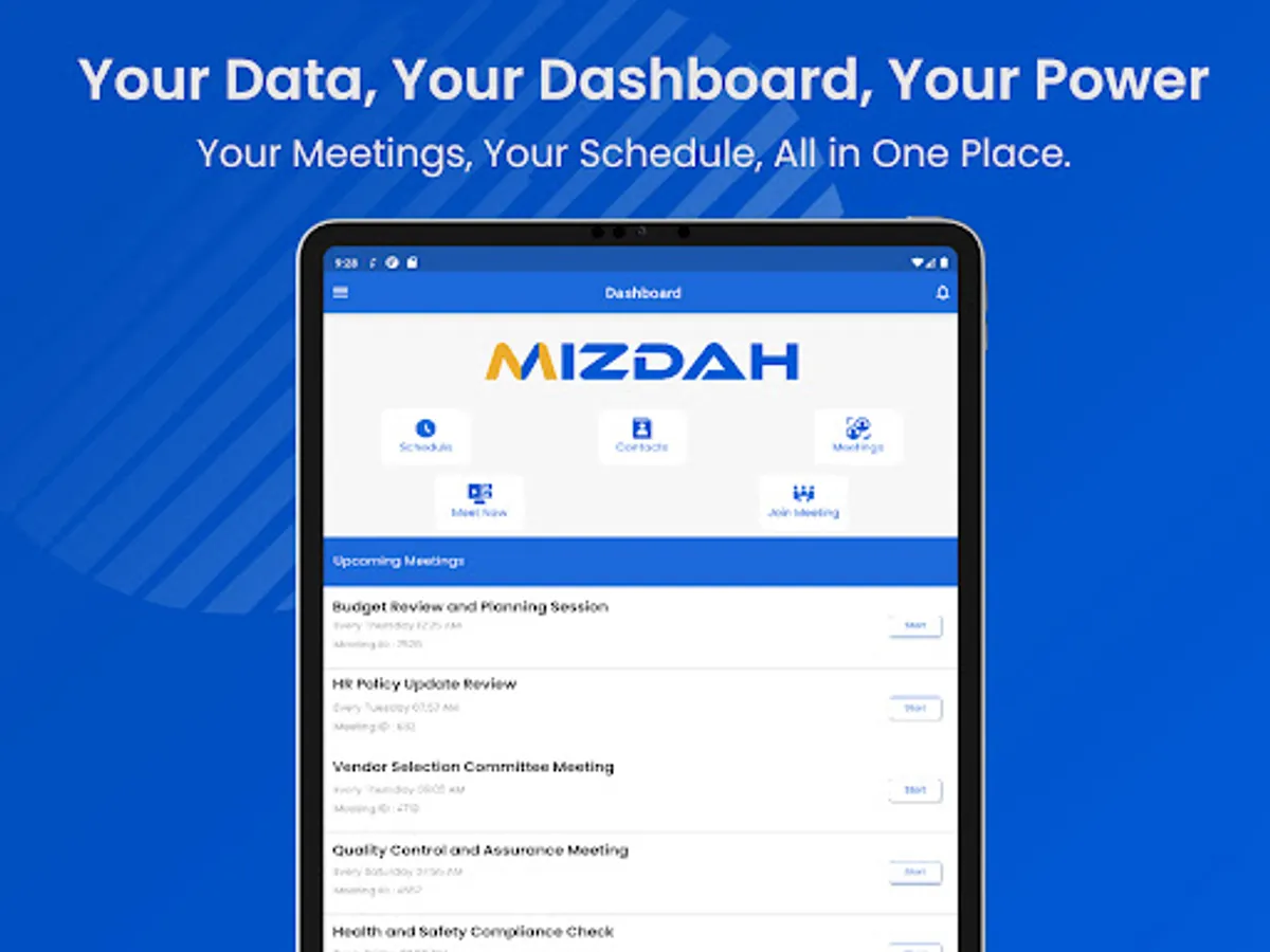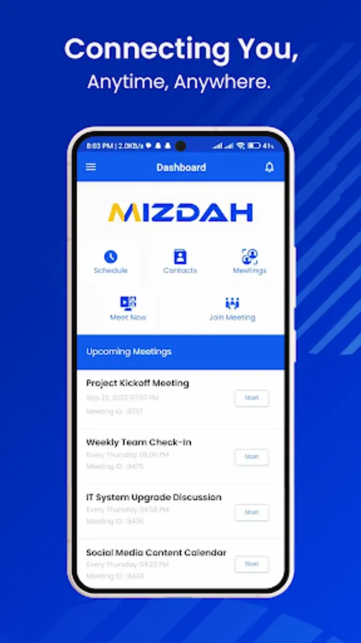 Are you looking for an easy to access, secure, reliable and high performance video conferencing and online meeting solution? Mizdah is the answer to all your collaboration needs, providing a high-quality audio-video meeting platform for corporate, educational, personal and family get-togethers. Mizdah is loaded with high quality features to make your video conferencing experience truly satisfying. It enables high-grade and fast video conferencing with any number of participants without dropping quality across all the different mobile devices any time anywhere. It supports setting up of meetings, inviting people to the meetings, screen sharing, real-time chat during the meeting, shared storyboard for brainstorming sessions and a range of other high value features to ensure a great user experience and convenience.