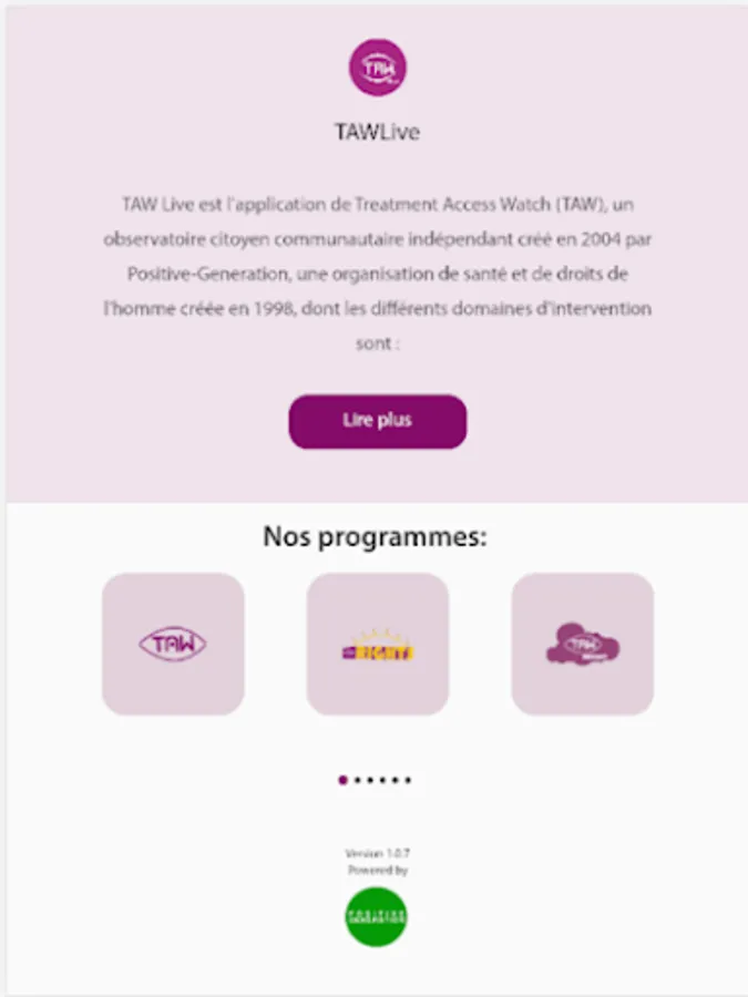 TAWLive is the application of Treatment Access Watch (TAW), an independent community citizen observatory created in 2004 by Positive-Generation, a Health and Human Rights organization created in 1998, whose different areas of intervention are: