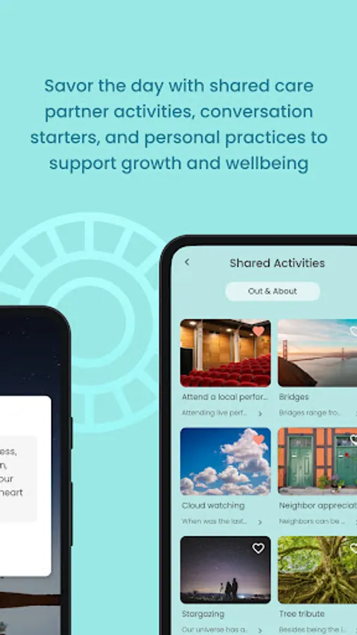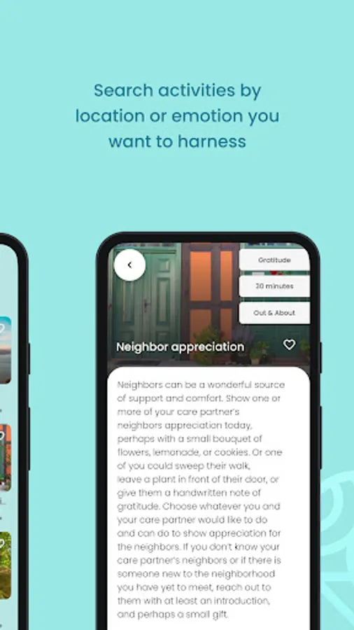 Access a diverse collection of shared activities designed for you and your care partner, revolving around the five core positive emotions – gratitude, empathy, forgiveness, love, and awe. Search activities based on location, time available, or the desired positive emotion you wish to harness. Each activity includes engaging questions to ignite conversation, encourage reminiscence, and strengthen your care partner relationship.