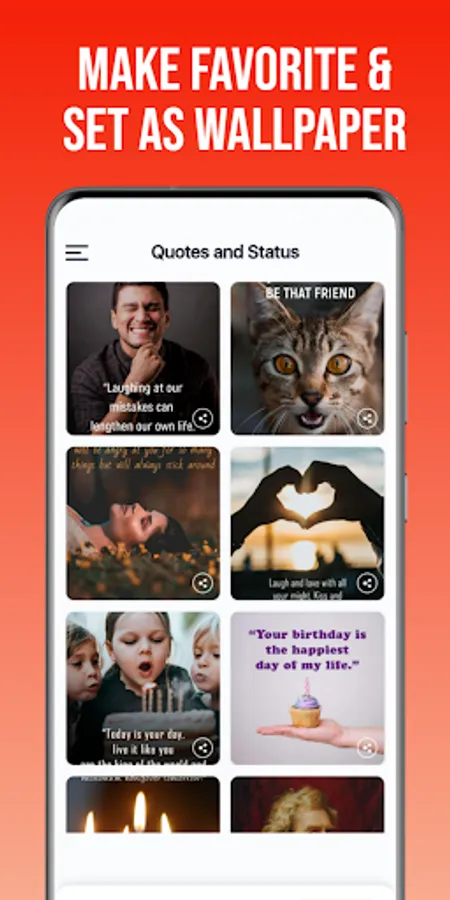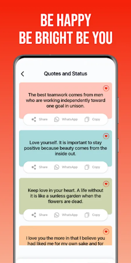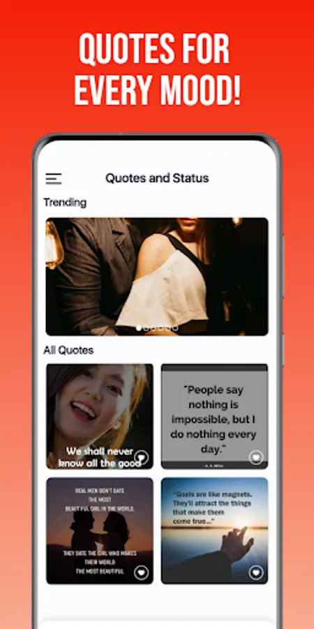 Quotes is the ultimate app for all your quote and status needs. With a vast collection of inspiring, motivational, funny, and heartwarming quotes, as well as customizable status updates, you'll never be at a loss for words. Whether you're looking for something to share on social media, add to your journal, or just brighten your day, Quotes has got you covered.
