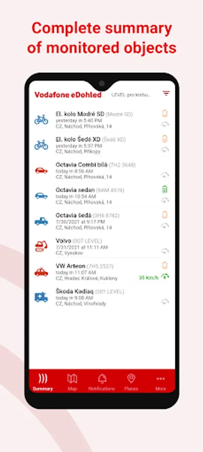 Vodafone eDohled is a mobile application for on-line access to a cloud GPS monitoring system for tracking, safety monitoring of moving or static objects (vehicles, trailers, containers, wagons ...). This application uses a combination of GPS / GLONASS and GSM technologies. Upon logging into the account, the user has an online overview and access to their asset anytime and anywhere in the world. Vodafone eDohled ensures continuous development and constant upgrading of the application, high-quality, high-resolution digital maps, and expert supervision 24/7.