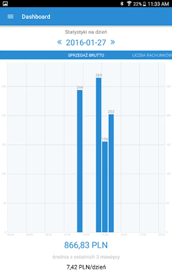 Current sales statistic - you have access to the latest sales data, which are presents in transparent and easy form. You can monitor receipts in real time. Application allows you monitor the number of bills and the average value of these bills. Additionally, you have always access to data from the last three months.