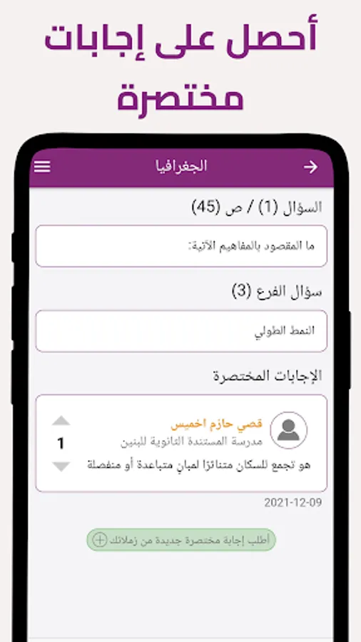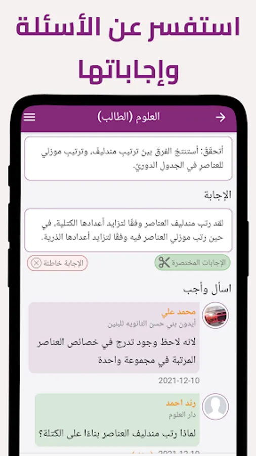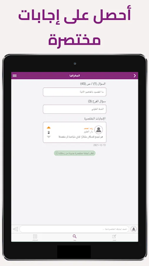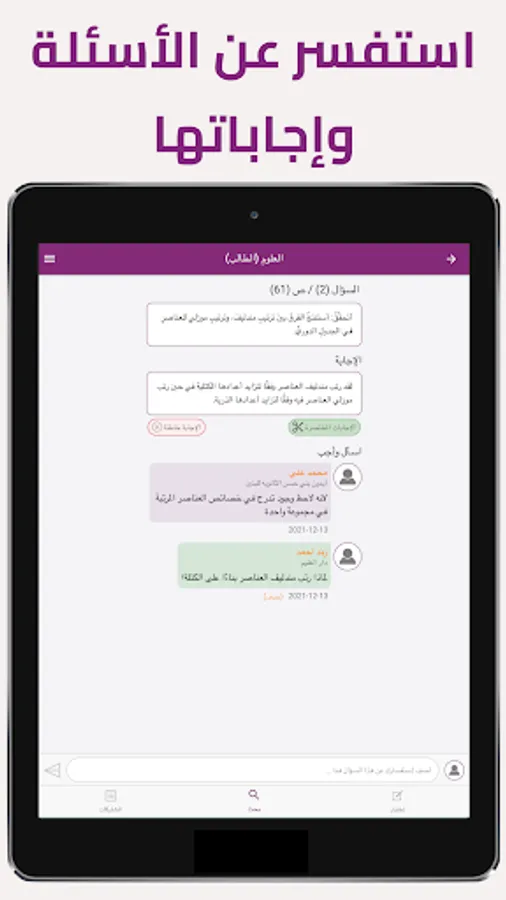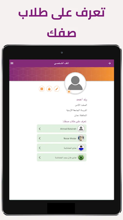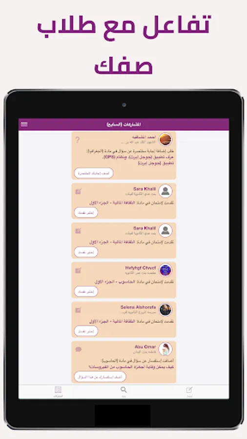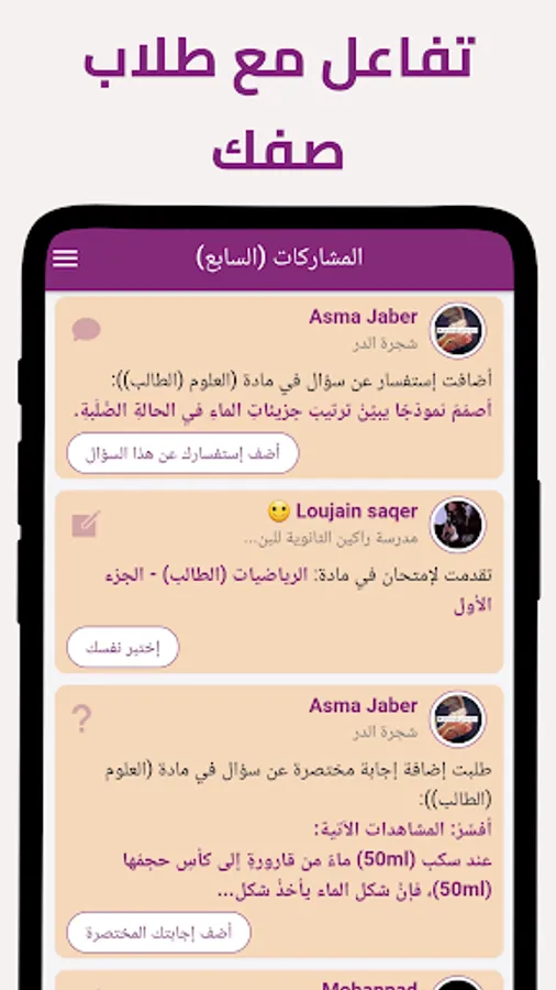 Each student gets his own account, which enables him to use the Manahil application and interact with students of the same class by using the "Ask an assignment" feature, which enables him to comment on questions and answers, add short answers and vote on them. In addition to identifying the students of his class in the same school who use the Manahil application. This is to provide a distinctive interactive experience that enriches the process of teaching and e-learning and increases students' understanding of the study materials, their preparation for exams, and their confidence to pass the exams successfully with the highest grades.