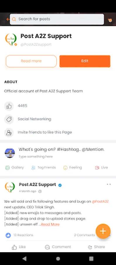 User Timeline, Pages, Groups, Games, Social Videos Support, Photo Album, Cover Picture, Profile Picture, User Privacy, User Profile Info, Notifications, #Hashtags, @Mentions, Post Publisher, Delete & Edit Posts, Comments On/Off, Save Posts, User Events, Recent Search, Live Chat, Live video, Messages, free audio and video call, Verified Profiles/Pages, fundings, blogs, Movies, Job, Marketplace, Monetization process, Pro Memberships option and much more. Soon you can find it on Google play store for android devices and App store for IOS devices. You can also access via web browsers (https://PostA2Z.com/).