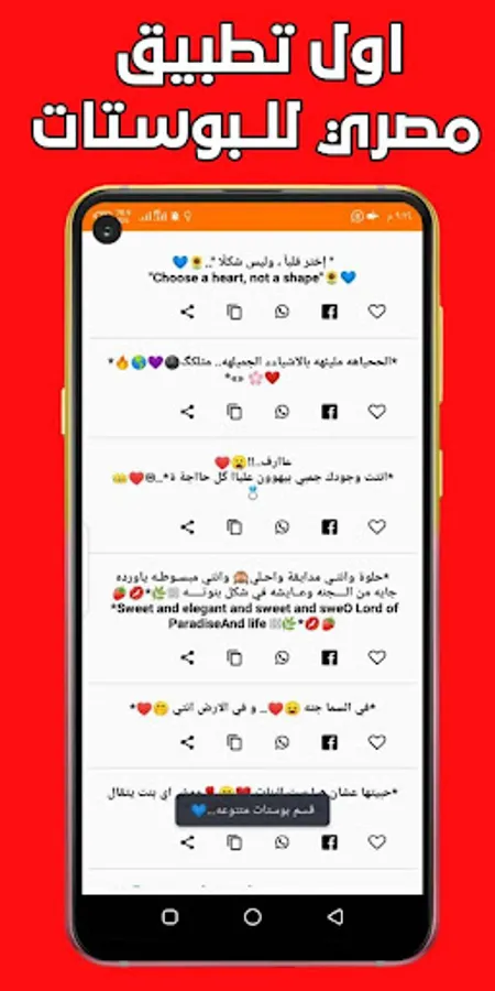 It offers the best and newest words, publications and posts for Facebook, Whatsapp and all social networking sites to exchange love between friends, loved ones and brothers by browsing the values you want and copying and pasting the status wherever you want all from within the application only