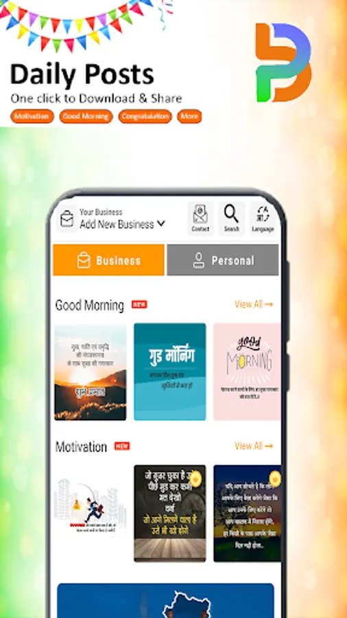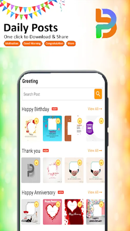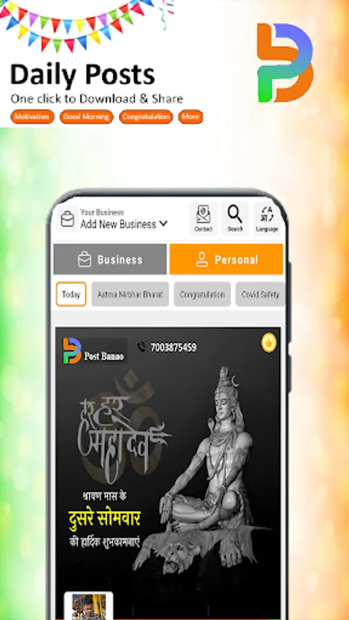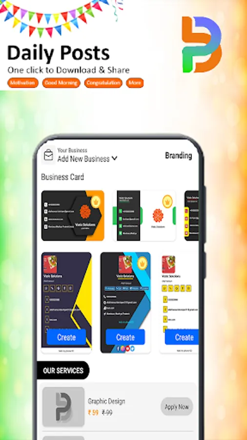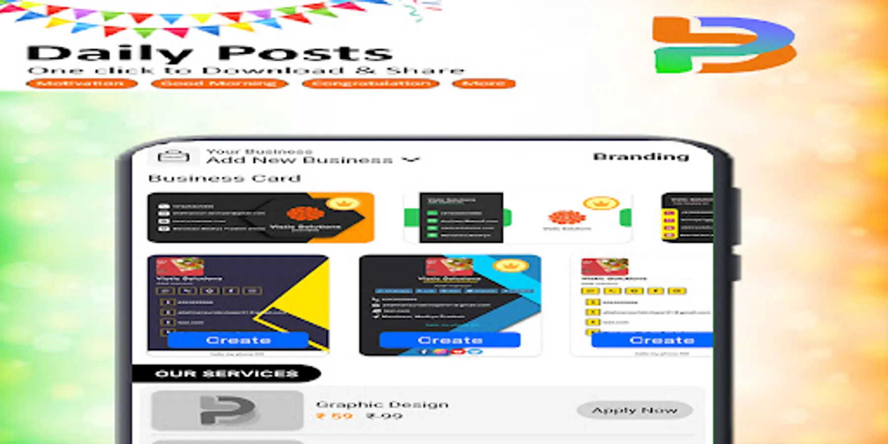 Create attractive and professional posters, flyers, banners, templates, festive greetings, birthday greetings, invitation cards, motivational quotes, cover photos, thumbnails, collages and ads easily in Post Banao. Also, you can get logos, digital business cards, brochures, Product Ads, branding designs, videos on Post Banao poster maker app.