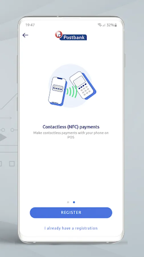 You can make contactless (NFC) payments from either a digital card you receive free of charge when you register in the app, or with any card, issued by Postbank.