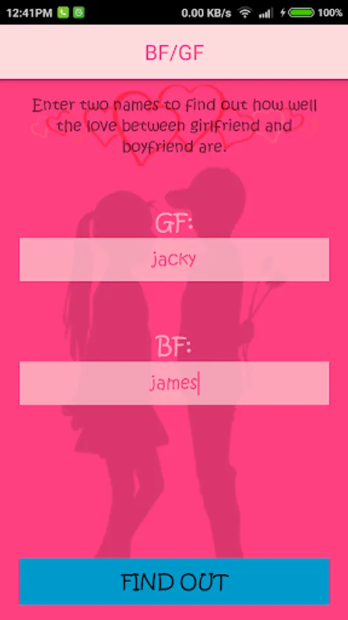 Play the ultimate Boyfriend/Girlfriend (BF/GF) test game. Enter the name of the two loved ones and find out what it has to say about this relationships phase of love. Feel free to try it out on others you know such as your friends or their friends and beyond.
