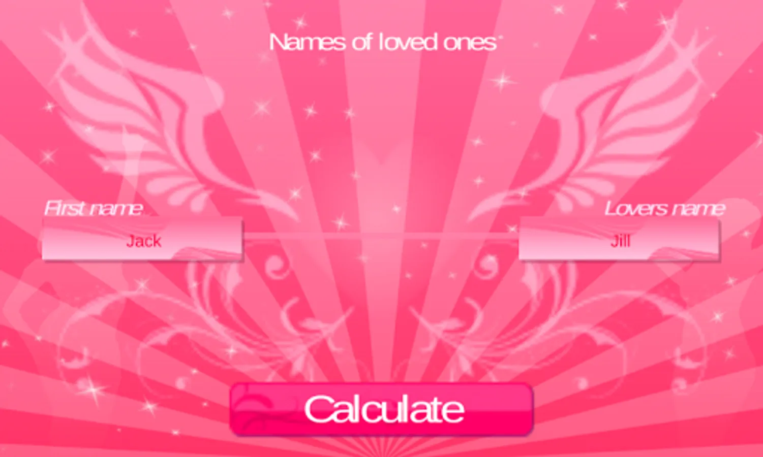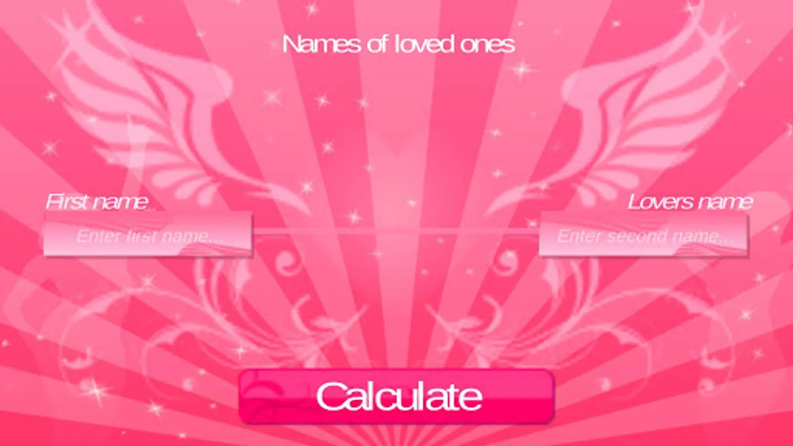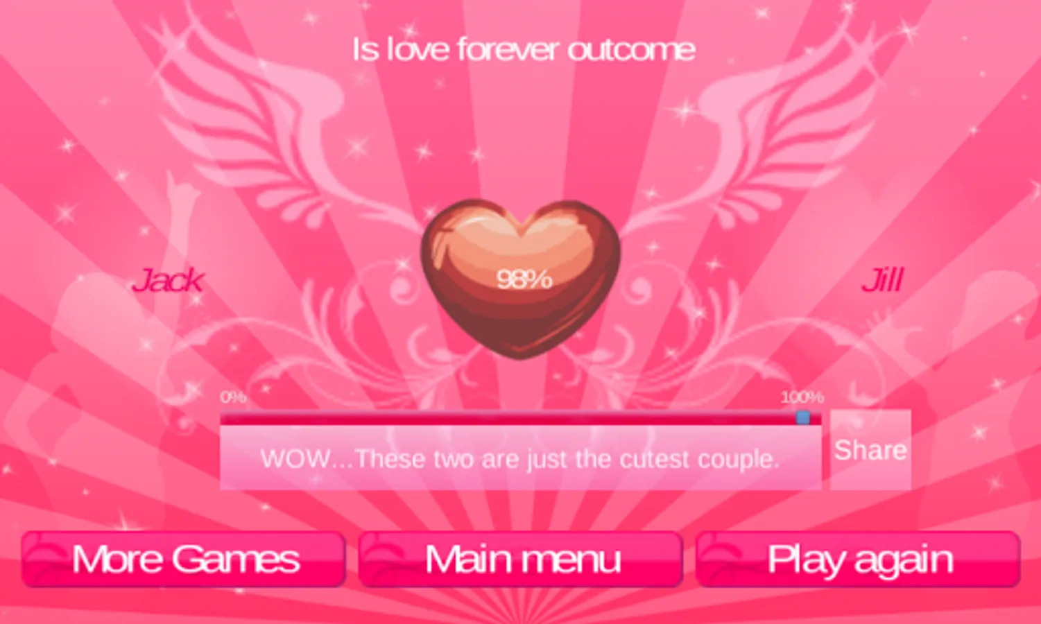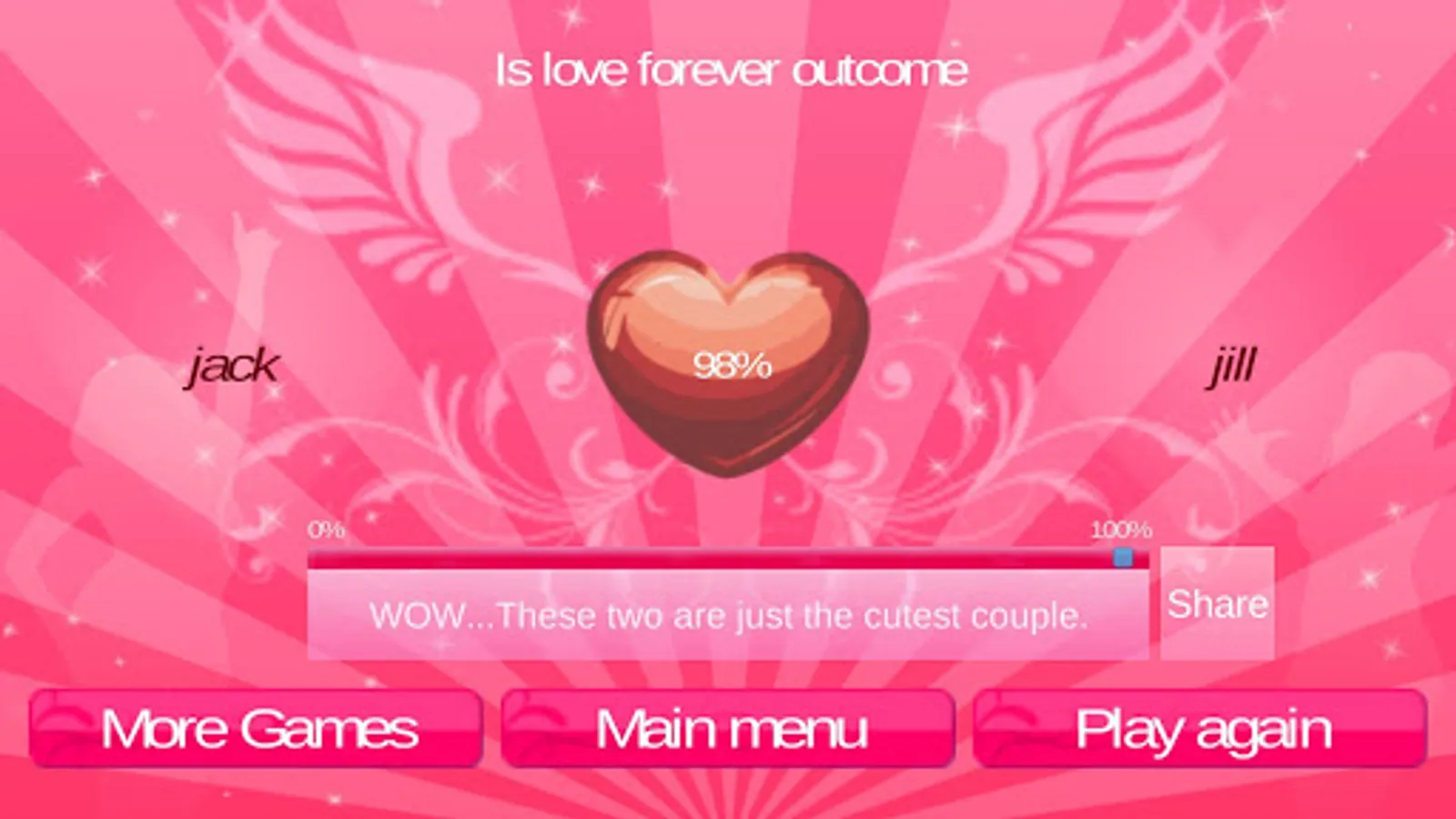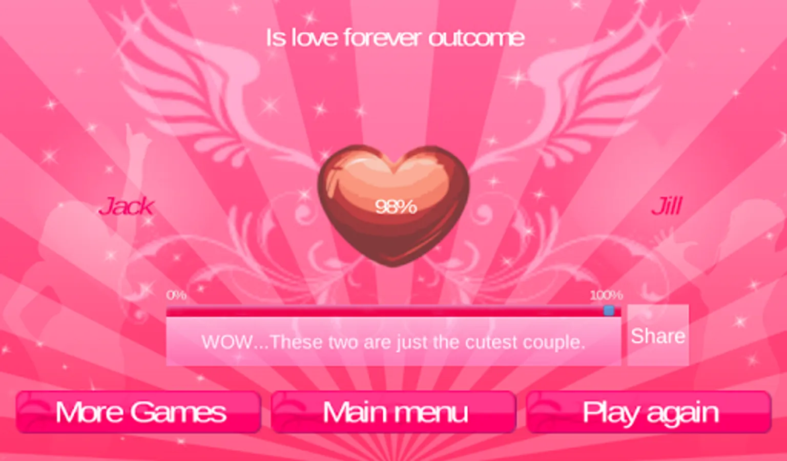 Find out if the love between two loved ones is meant forever in this lovely love game! All you have to do is enter the names of two persons in love or persons with maybe a spark or two. Finally find out what "Is love forever" has calculated for these lovers? Feel free to try it out on your friends or their friends and beyond.