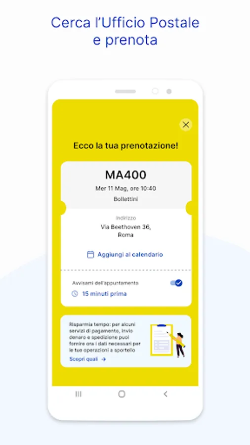 • Book an appointment: choose the Post Office and time most convenient for you on the map, you will receive a personalized reminder and just go to the Post Office at the set time, avoiding waiting times