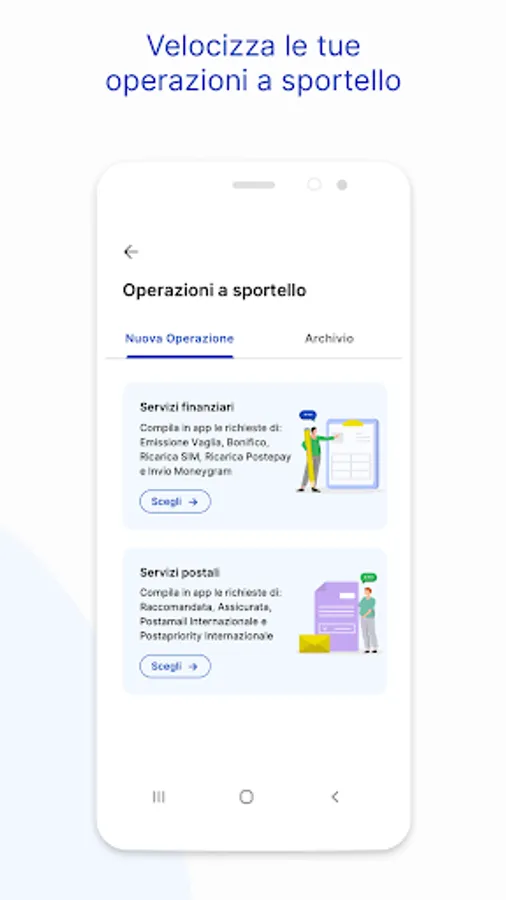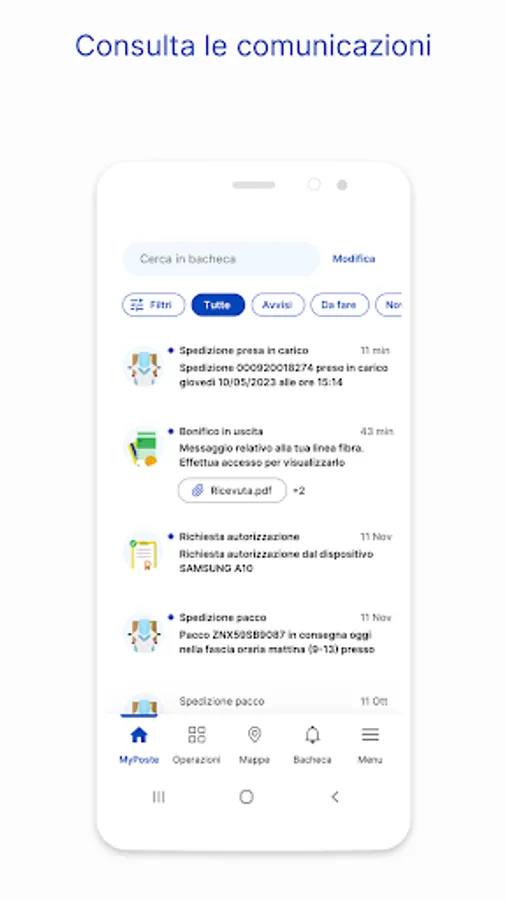 • Consult communications: quickly and easily carry out advanced searches among communications received on the Notice Board from Poste Italiane (notices, memos, payments)