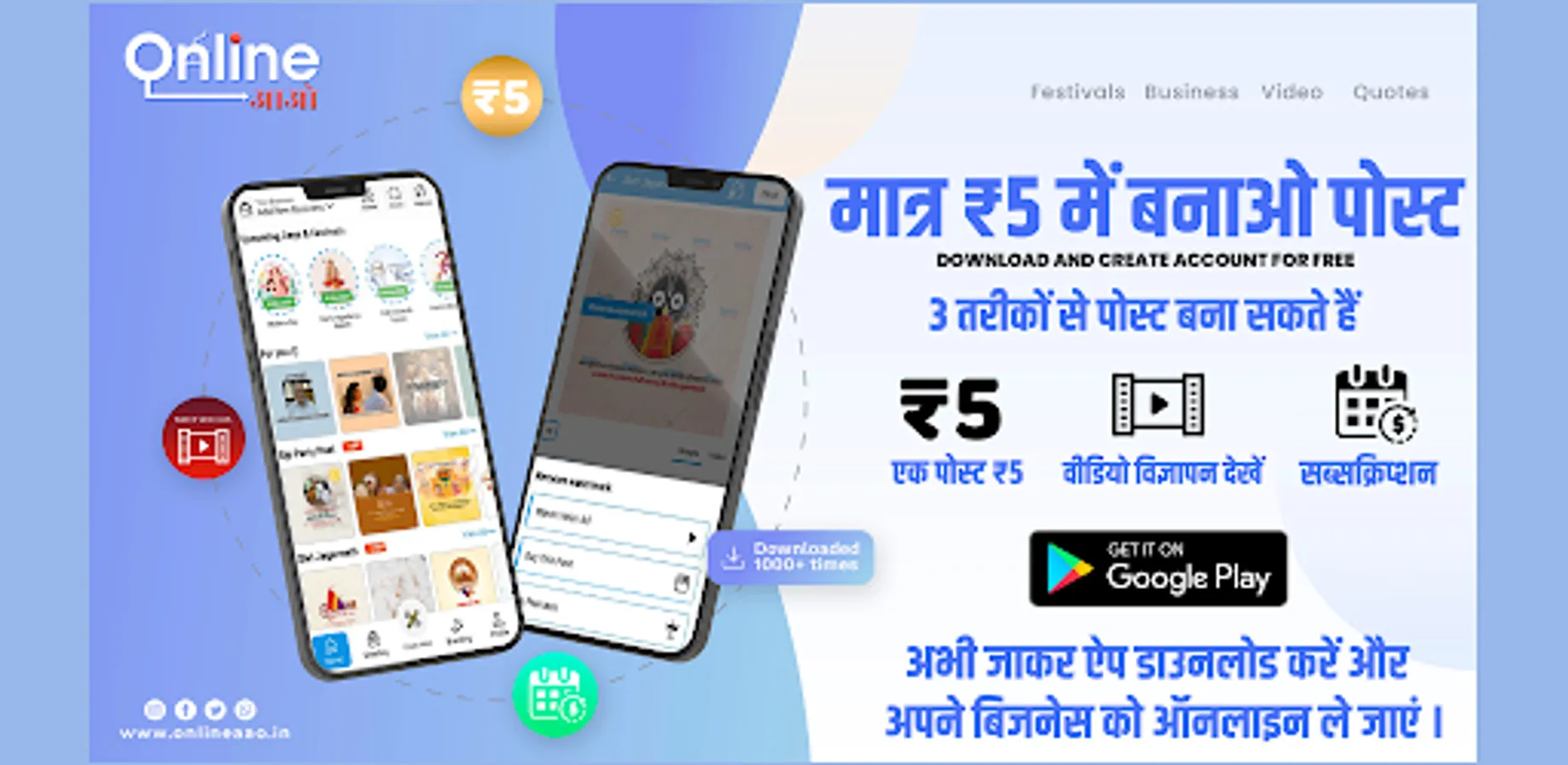 Onlineaao ऐप के इस्तेमाल से आप रमजान ईद और अक्षय तृतीया के ढेर सारे रेडीमेड पोस्टर्स, बैनर्स और वीडियो स्टेटस बना सकते है, जिसमे रमजान पोस्ट्स और रमजान ईद पोस्टर्स, अक्षय तृतीया स्टेटस, मदर्स डे कोट्स, रमजान ईद व्हाट्सअप स्टीकर, रमजान शुभकामनाये, रमजान बैनर, महाराष्ट्र दिन पोस्ट्स, कामगार दिन बैनर, कामगार दिन पोस्ट्स, आंबेडकर जयंती पोस्ट्स, रमजान कैलेंडर, रमजान दुआ, मदर्स डे , बुद्ध पूर्णिमा, कामगार दिन , महाराष्ट्र दिन, लेबर डे, लाफ्टर डे पोस्टर्स ये सब शामिल है.