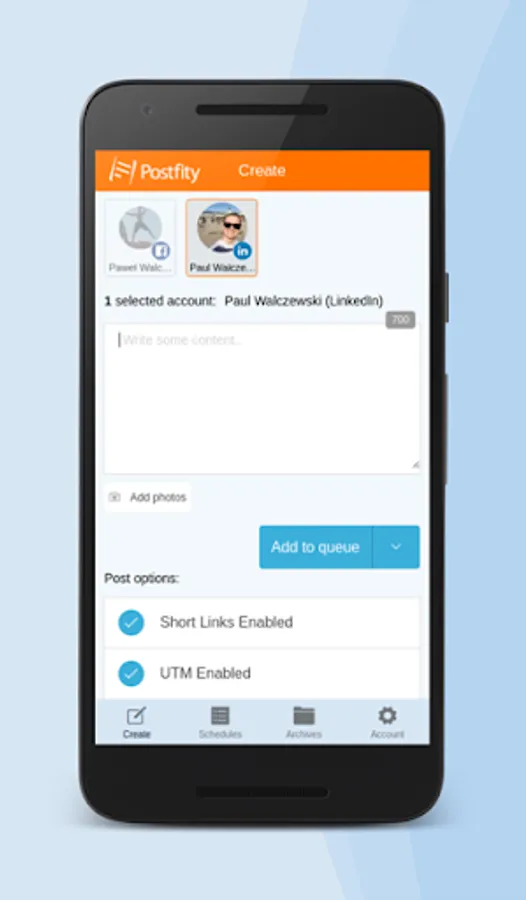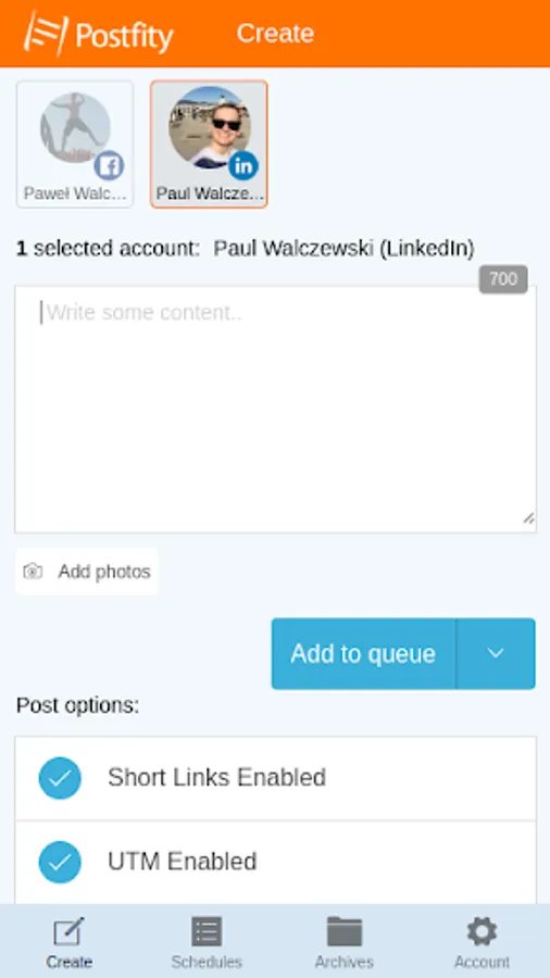 Simple yet powerful - app supports uploading images from both camera and device storage, scheduling and automatic queueing of posts, UTM links tracking, links shorting, archives and more.