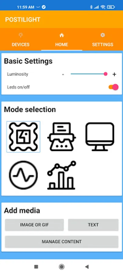 - Select display mode (bitmaps, texts, math drawings, uniform color, bargraph)
