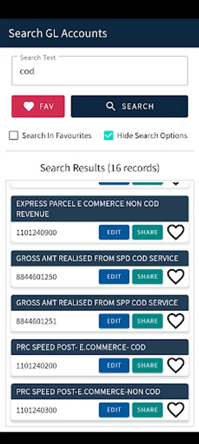 You can edit the labels of GL accounts/Material codes for easy searching, mark as favourite, view list of favourites and share the data with other people.