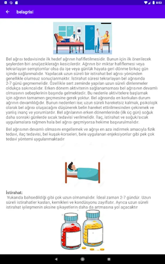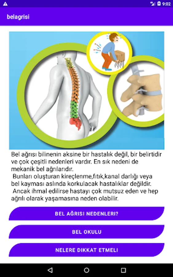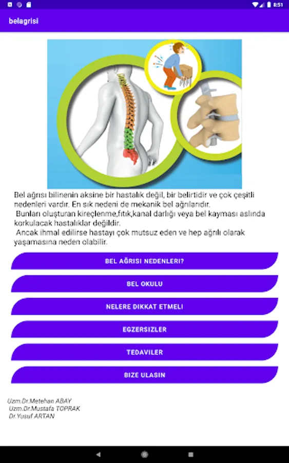 In this application, we aimed to inform you about the causes of low back pain, what needs to be considered in daily life, exercises and treatments with our specialist doctors.