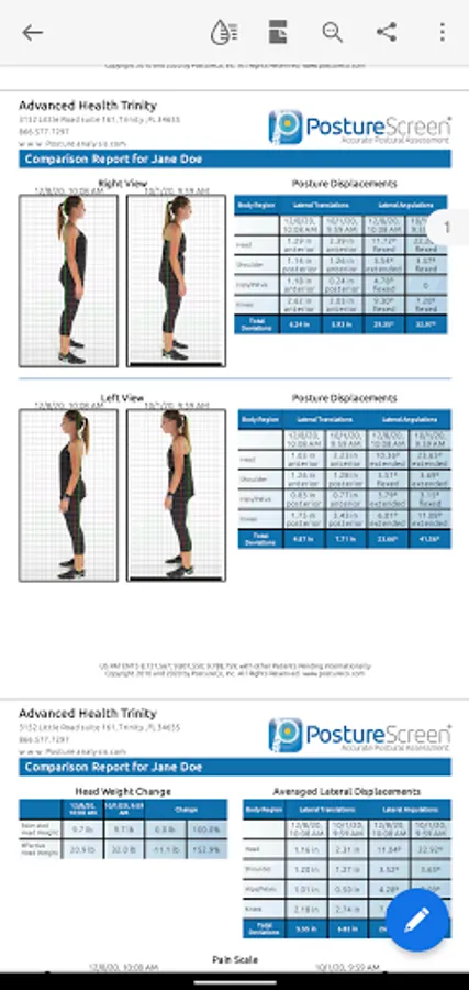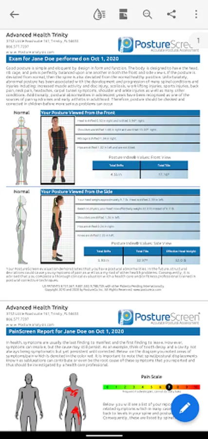 When on subscription, PostureScreen also offers in this powerful software a pain diagram, patient demographic export, educational movies, and customizable email templates and Report PDF documents that show the results.