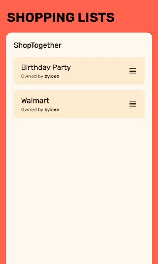 ShopTogether allows you to create and share shopping lists with other people. Add, remove or edit items and see them update in real time for everyone!