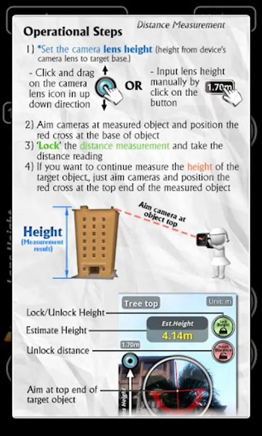 Auto Measure uses the height of the camera lens and its tilt angle to calculate the distance to the object. You can continue measure the height of object by lock the distance and aim the cameras at the top of target object, as shows in the preview image. The only parameter required in this mode is the lens height, which is the height of your camera height to the base plane.