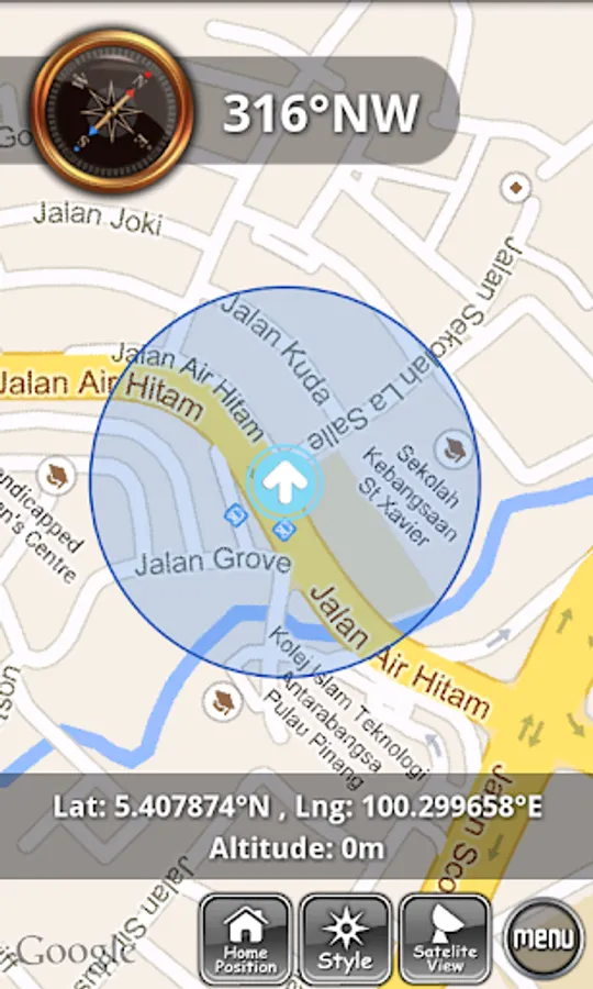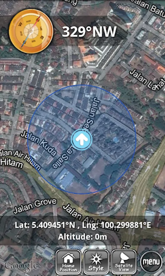 It shows your current position, direction of your current movement and true/magnetic north on the map. The map rotates based on the compass orientation and direction, helps you navigate to your destination. You can switch the map view between Satellite view and Street view.