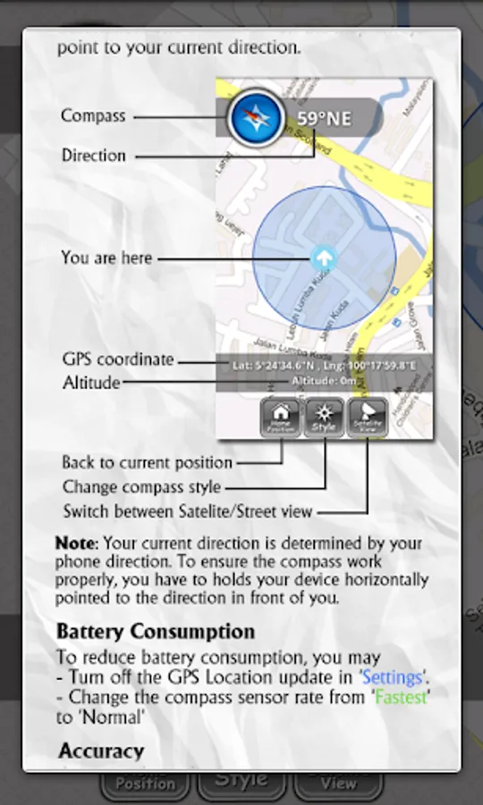Other than display the direction on map view, it also detect the best network connection between GPS, Wifi and 3G to retrieve the latitude, longitude and altitude data of your current position and display them on the main screen.
