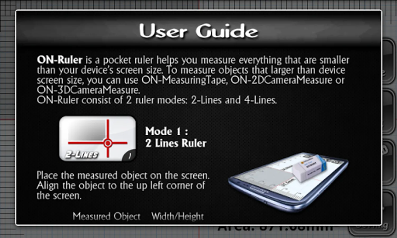 ON Ruler is smart and easy to use. You can measure the length and width of any objects that in the range of your screen size by simply place it on the device's screen and move the line limiters one after another. The dimensions of the object (width, length and area) will shows on the screen automatically. To measure objects that larger than your device's screen size, you can use ON Measuring Tape, ON-2D Camera Measure or ON-3D Camera Measure (Free measuring tools).